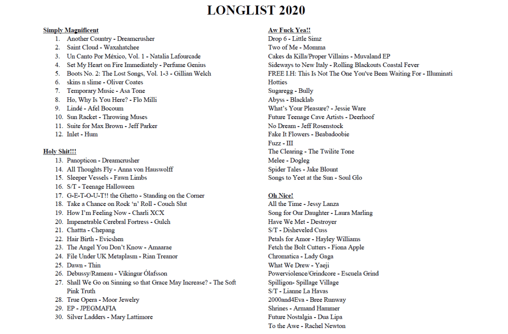 Experimental and ambient releases also seem over-indexed here, something I’m a little self-conscious about since I’ve spent the last few years crafting a self-narrative that positions me as a connoisseur of Big Dumb Bitch Pop—but perhaps the need to feel elsewhere and otherwise this year won out in the end (stay tuned for my favorite songs list where BDBP will be much better represented). Between Pandemic/Political Revolt Albums and Not Pandemic/Political Revolt Albums, I couldn’t say that my favorites of the year skewed one way or the other. I can say that my favorites were those that coaxed me into another world, seduced me, and convinced me to stay. To try and see both the forest and the trees simultaneously, my only real ranking criterion was how much they impressed me—not in the sense of some great judge that must be stirred to appreciation, but in the sense of “making a mark or design on (an object) using a stamp or seal.” So here’s a list of the albums that left the deepest impression on me this year, the music that marked me as its own.